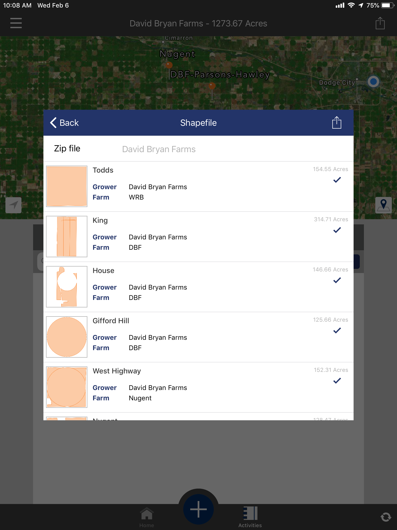 Shape files can easily be exported from the Servi-Tech app on your iPad and stored either locally, or in iCloud or Drive storage. This came up as someone was trying to import field boundaries while placing a bridgebuilder order on their iPad. From any of the Grower, Farm, or Field views in the Servi-Tech app, select activities. Then click the share button at the top right of your screen (the square with the arrow pointing up.)